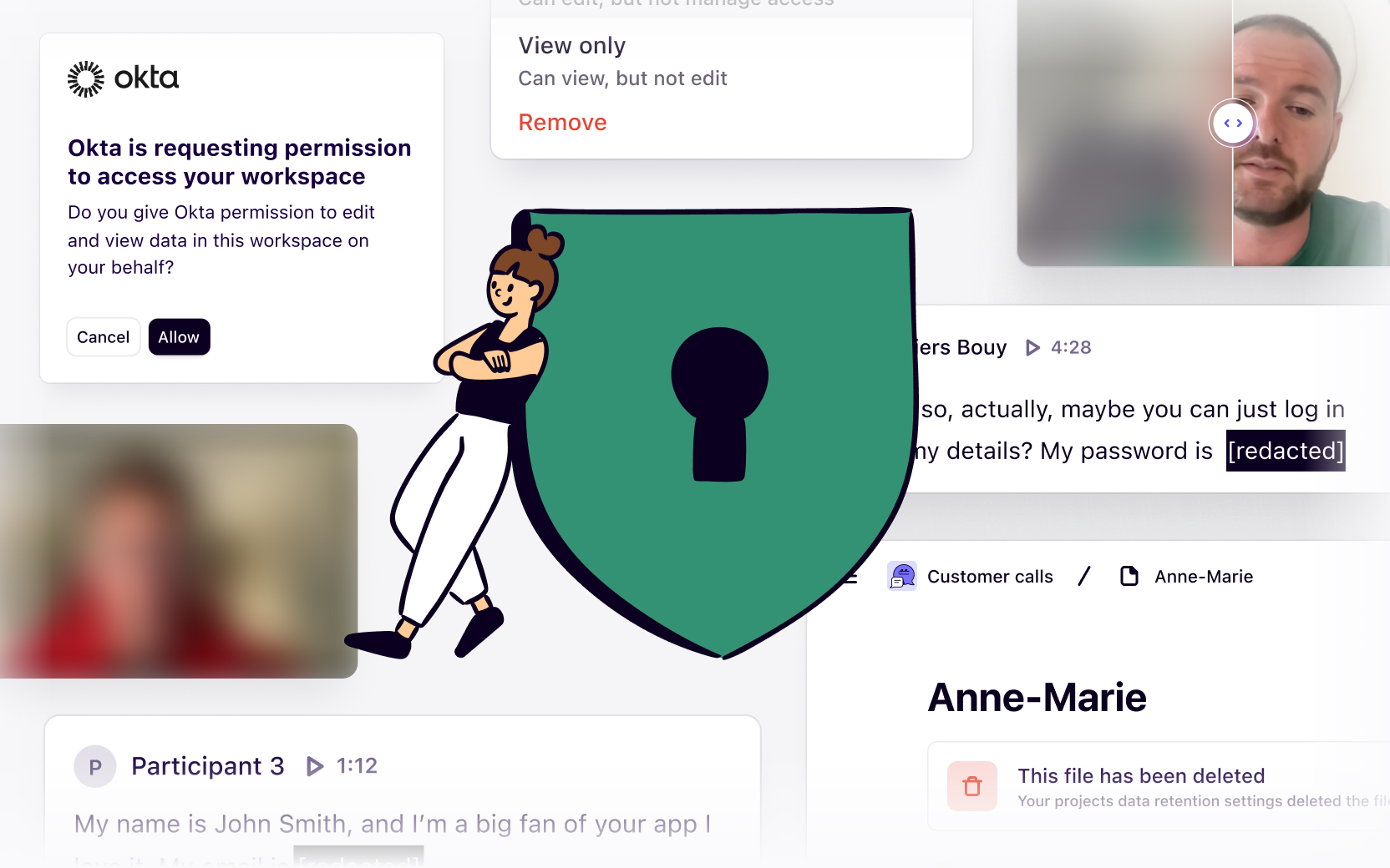 Handling customer data requires robust security and privacy measures. Dovetail is built to meet stringent security and safety requirements and to help customers fulfill compliance obligations such as GDPR and HIPAA. Features include redaction of personally identifiable information (PII) from text, audio, and video. Dovetail also assists with data lifecycle management, such as automated data deletion based on retention policies, while retaining insights and summaries.