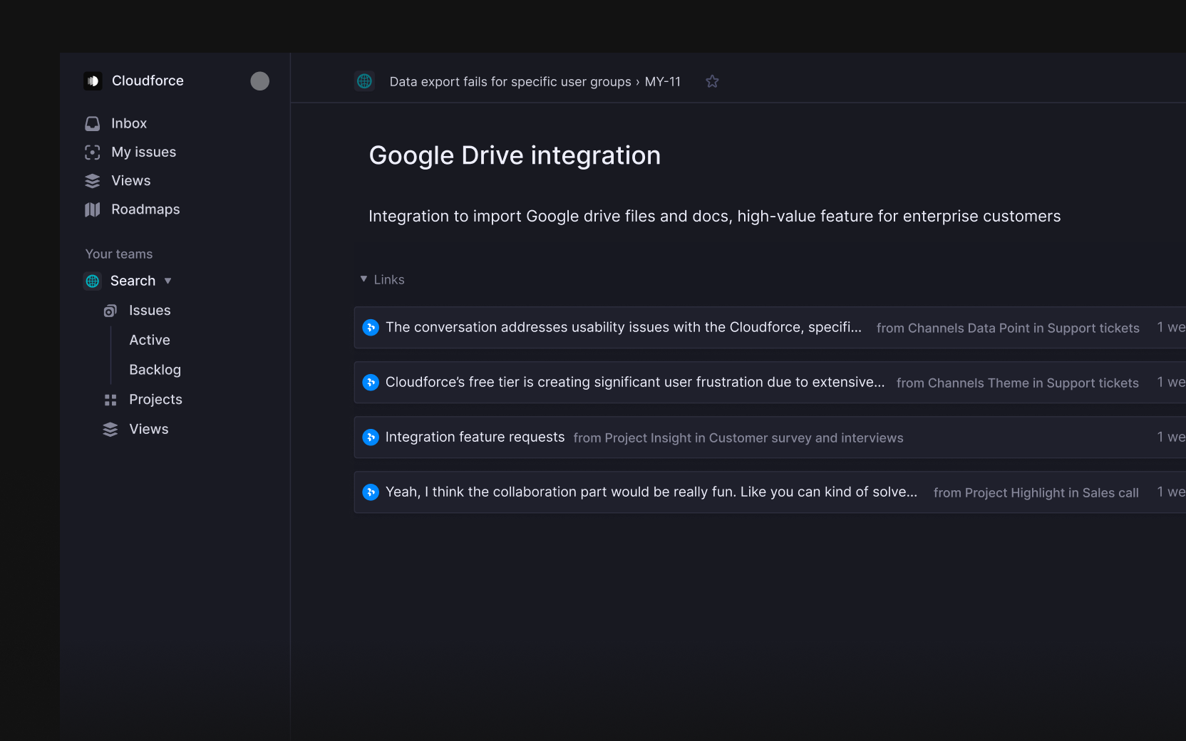 Chat then presents an option to “Create Doc from this conversation”. Once she clicks it, Dovetail's AI Docs feature instantly creates a rich, evidence-backed report, complete with linked themes and direct links to the relevant customer quotes. Chloe attaches the document to a Linear ticket and alerts the product team to the significant revenue risk if they don't prioritize fixing the export flows.