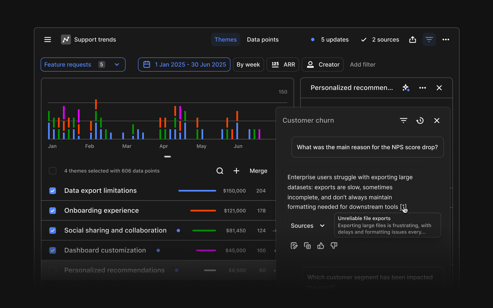 Clicking into the data, she is linked to a channel with feedback from tens of thousands of support tickets. The top theme is crystal clear: “Hard to export data”. To dig deeper, she uses Dovetail's Chat feature.
