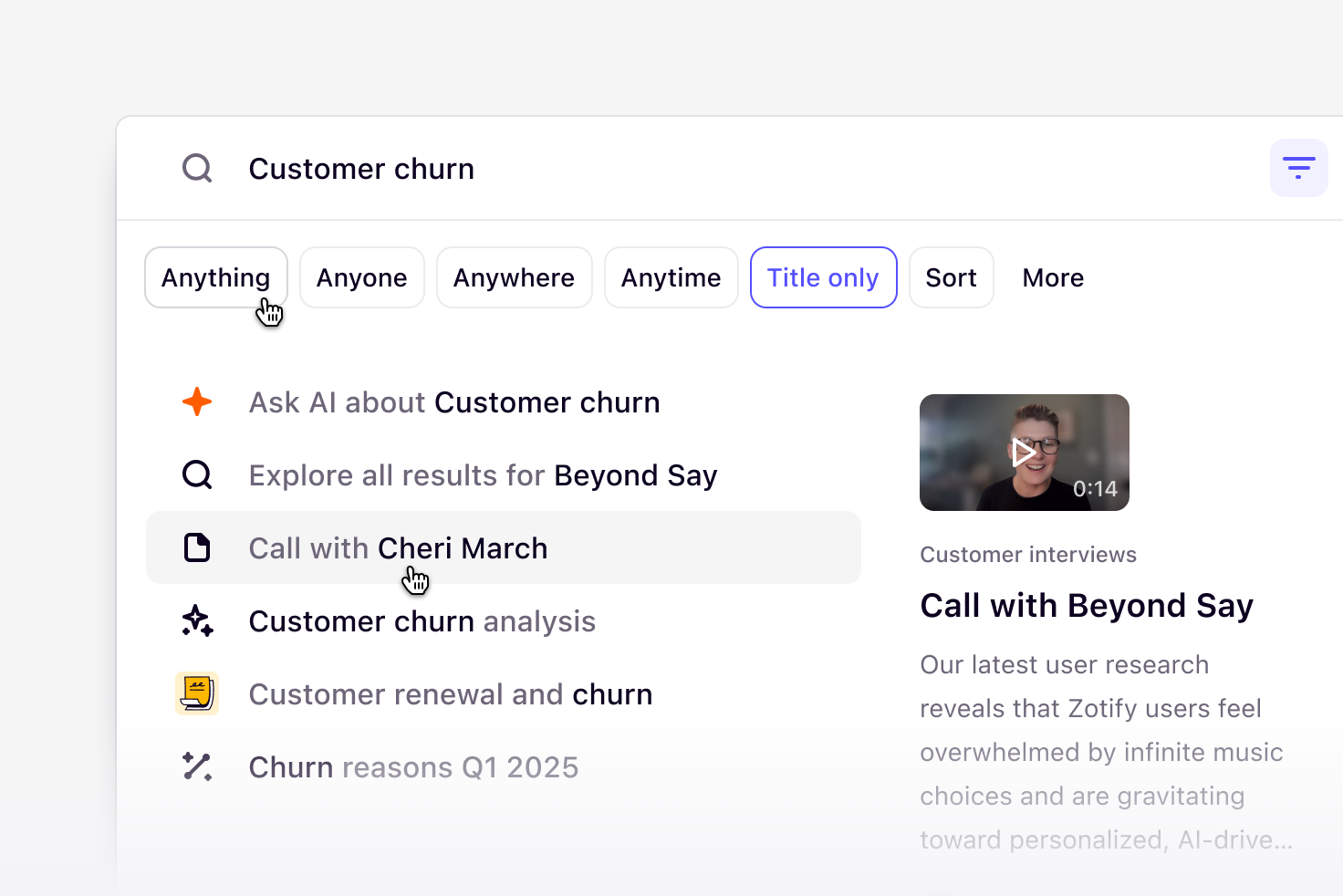 We’ve redesigned the search experience to be cleaner, more powerful, and more intuitive—and significantly faster. You can now apply filters using natural language, making it even easier for everyone—regardless of how frequently they use Dovetail—to gather the intelligence they need to make more data-backed decisions.