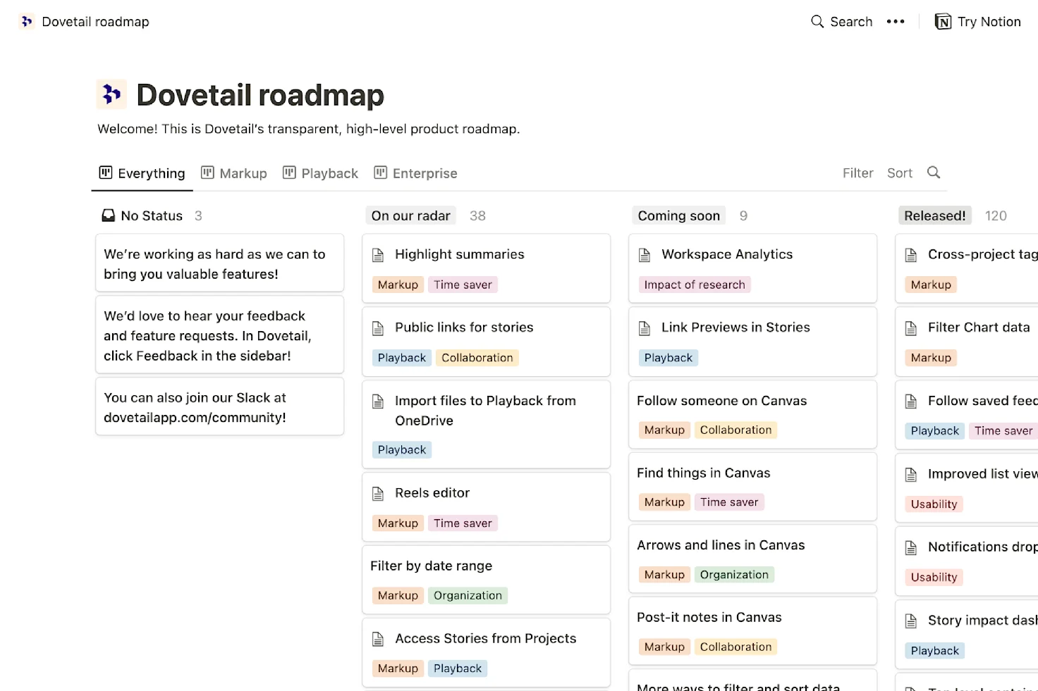 This model lets customers—primarily end users to begin with—mature their relationship with a product at their own pace. Typically, the more value they get, the more they are willing to pay. The decision-making criteria of the end user is now based on personal productivity—will this product actually help me day-to-day? It’s imperative to both design and solve problems for the end user. Over time, as more and more end users adopt, engage with, and get value from a product, organizations drive standardization around the access, usage, and administration of that product. In reality this often results in a centralized decision to purchase, roll out, and manage the product.This growth model of 1) starting with the end user, 2) allowing demand and usage to increase organically or virally to spread to multiple users, then teams, and then departments, and eventually 3) company-wide and centrally managed, is the basis of PLG. While the foundation underpinning product-led growth is well understood, we’ve also sought out unique ways that build upon those principles. Here are five ways we reinforce product-led growth at Dovetail: