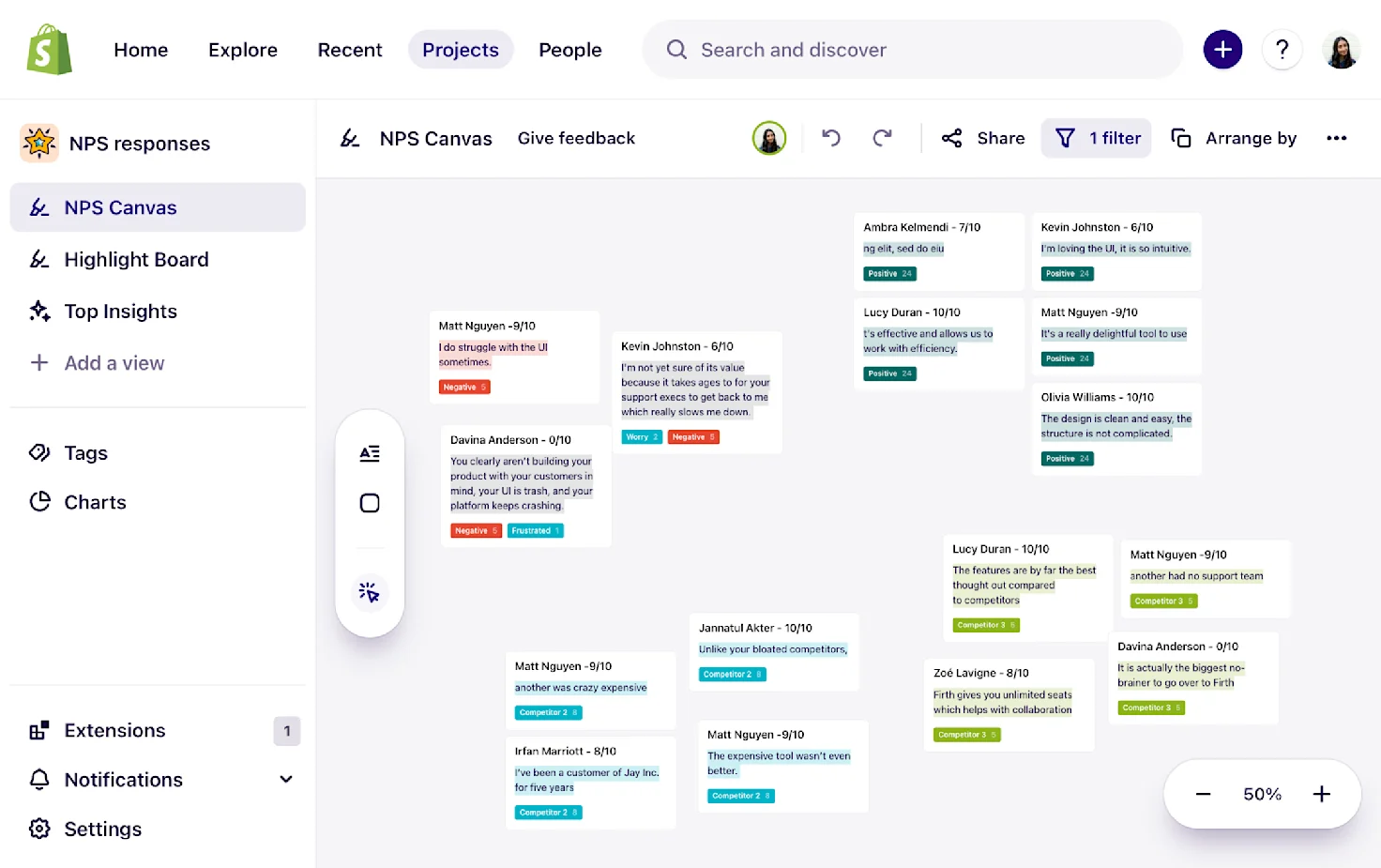 Dovetail projects will soon be reimagined with ‘views’, enabling you to create and save custom views of notes, highlights, and insights displayed as a grid, table, list, board, or even a canvas. Views are very flexible to enable different analysis workflows for different projects. We’ve been working on views for several months and are excited to get it into our customer’s hands.