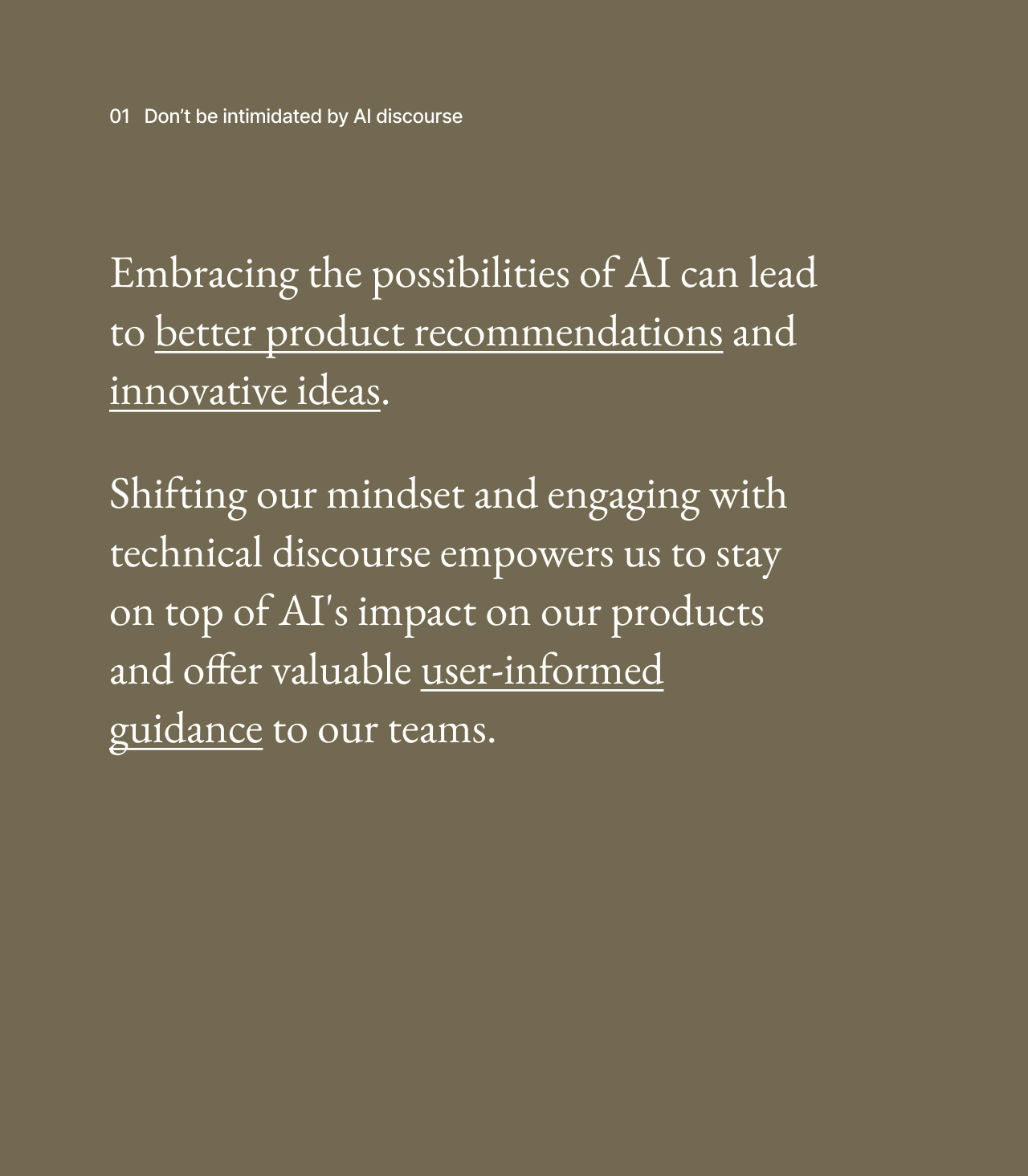 As soon as you decide and believe you can stay on top of AI as it relates to your product landscape, you’ll be giving user-informed guidance to your product team that fuels the innovation your company is undoubtedly going for.