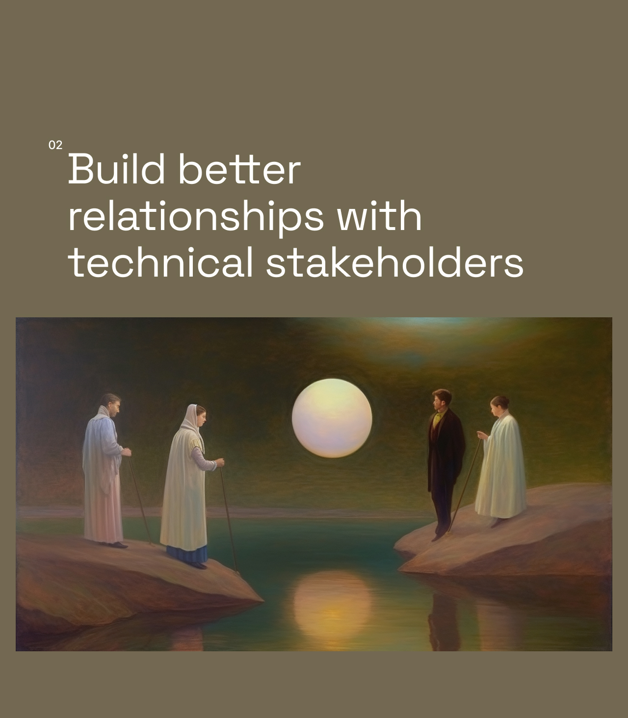 This may require rethinking how and when you incorporate tech stakeholders into your flow. You’re off to a good start if you’re used to inviting tech leads when presenting research results. But maybe you want to consult with your dev or research team even when planning a research project to check and see if the technical landscape lends itself to questions about users that you may not have thought of on your own.