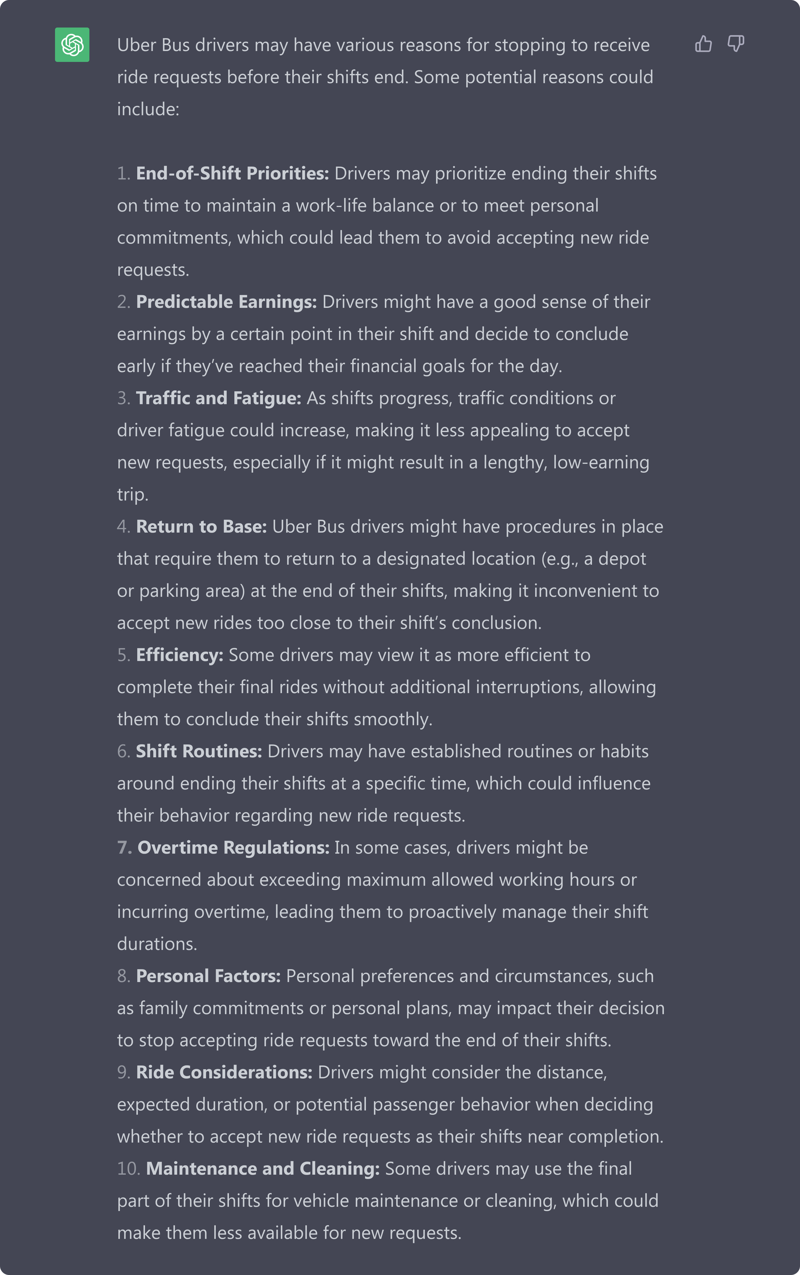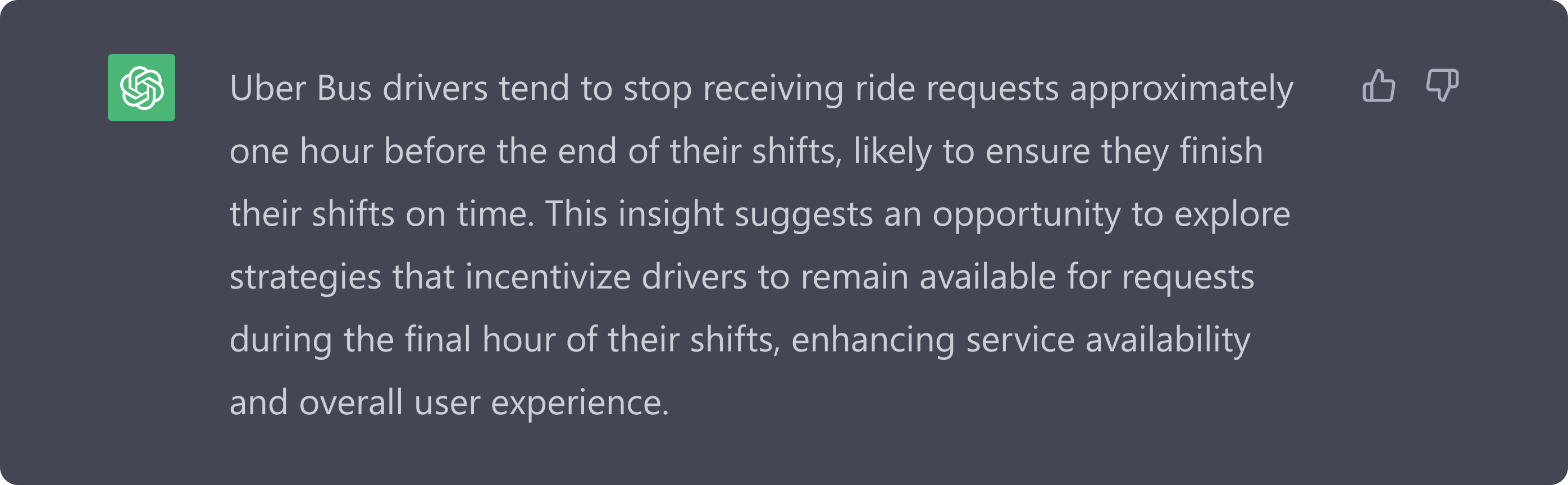 Take, for example, the above insight about Uber bus drivers. We know they aren’t taking ride requests about an hour before the end of their shift, but—based on the insight as written—we don’t know why. A conversational assistant might be able to help offer new hypotheses to explore.