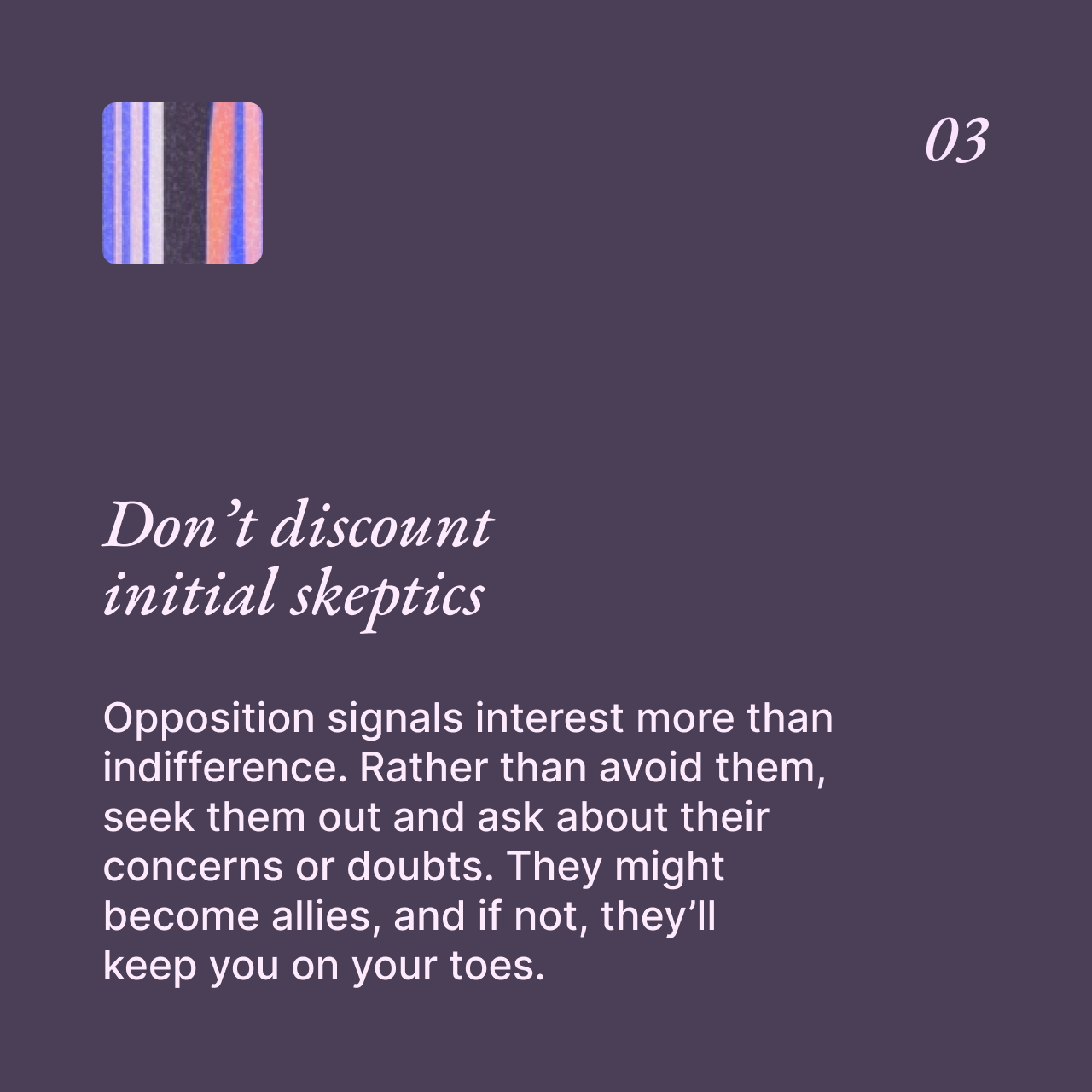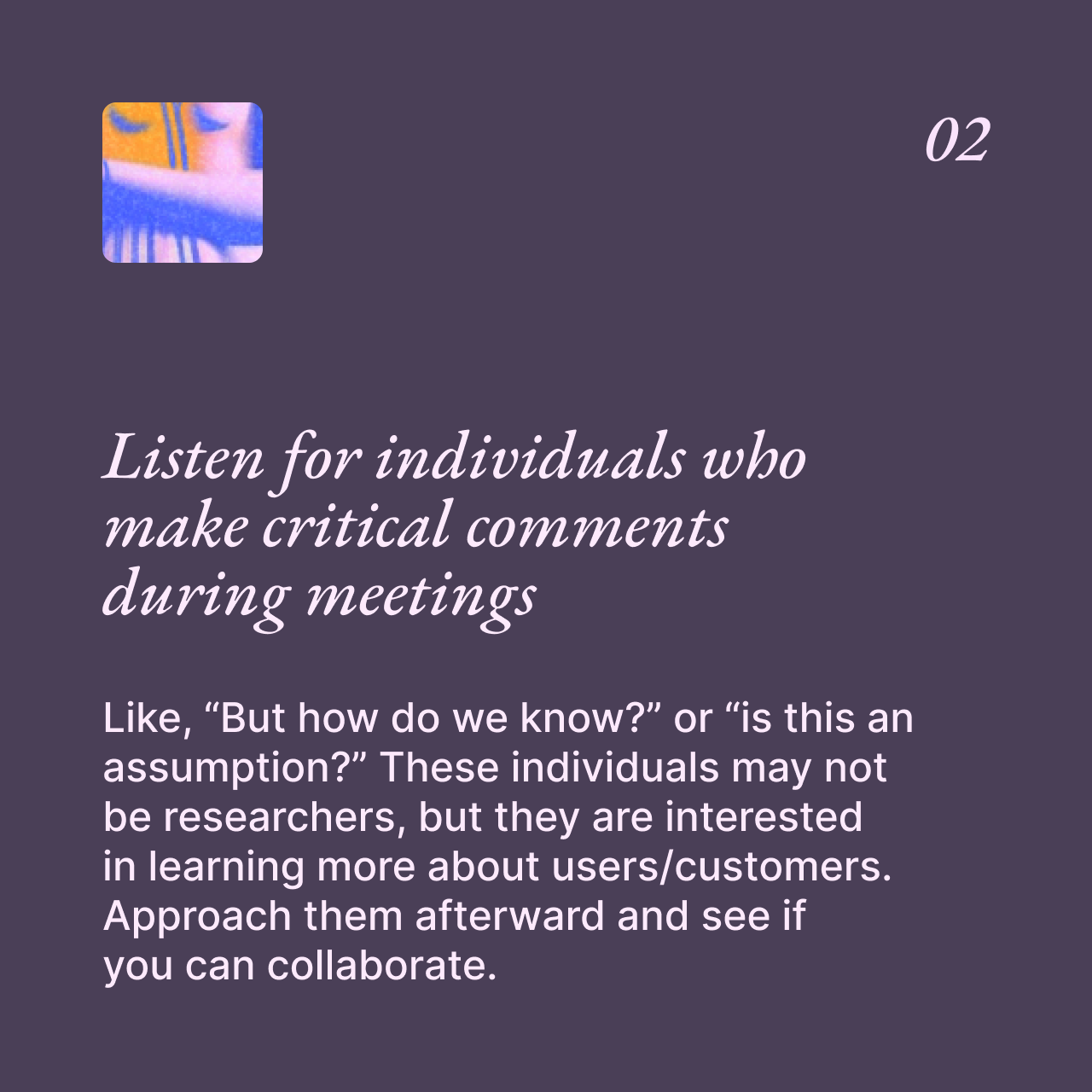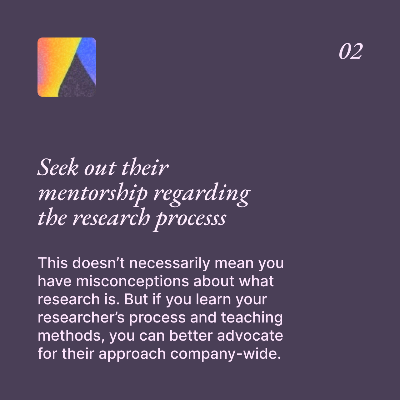 - Encourage them to vocalize their advocacy. These individuals can be powerful advocates for research within the organization. This could involve inviting them to speak at company-wide meetings or providing them with the resources they need to champion research in their teams.