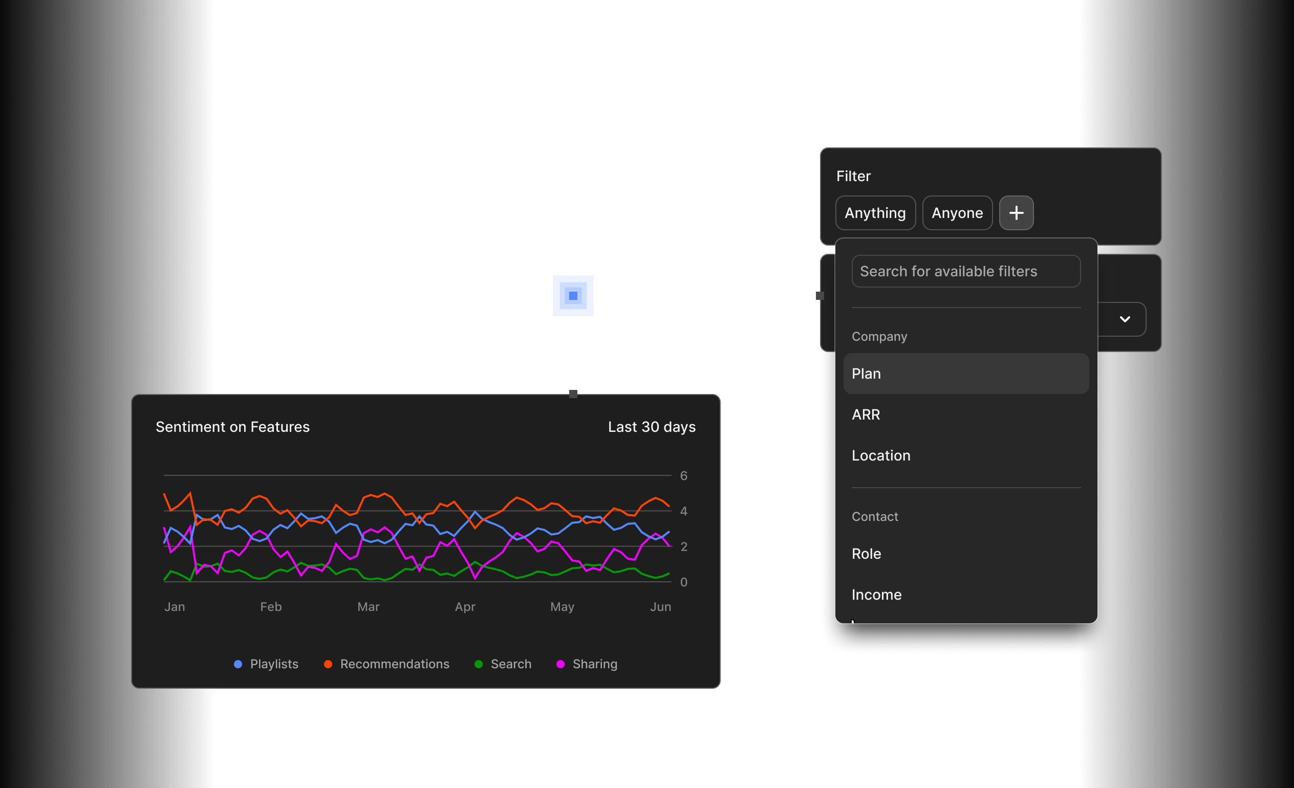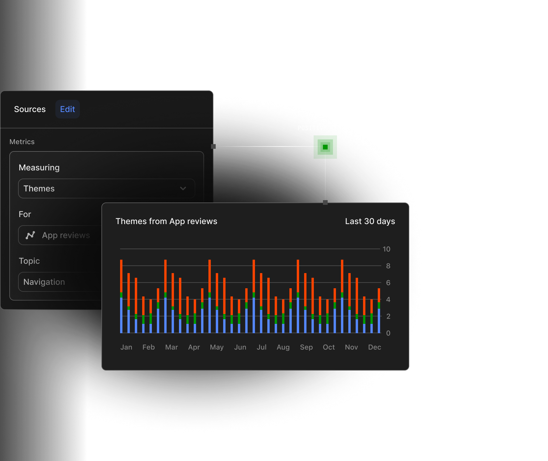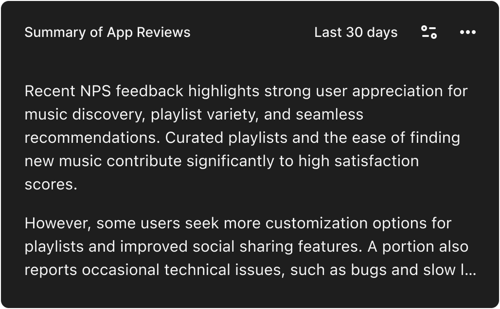 Visualize customer sentiment, feedback themes, NPS, and CSAT in customizable dashboards. Slice across segments to proactively identify risks and measure the impact of your product decisions.